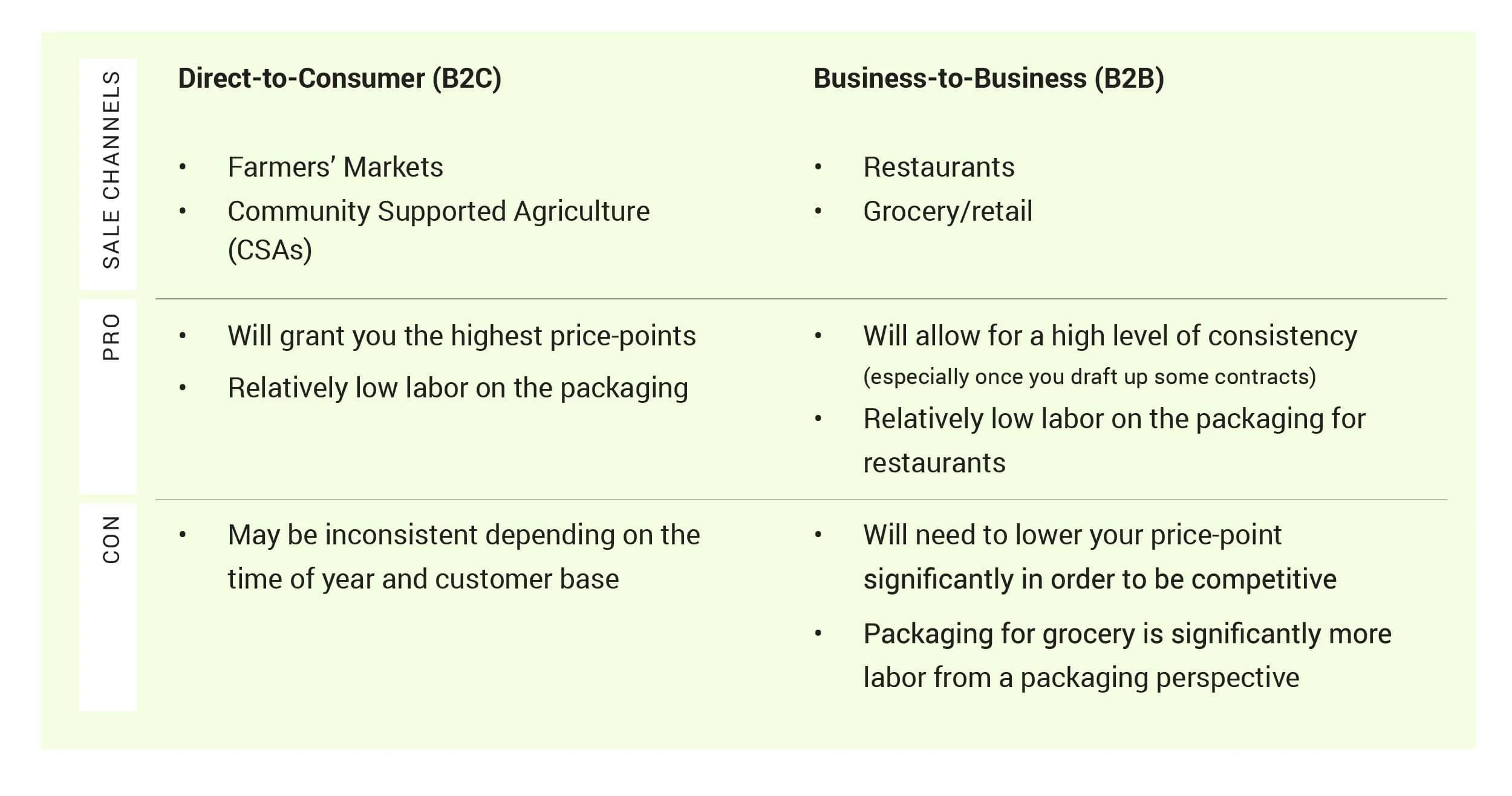 That said, in some locations, the consumer willing to spend extra on high-quality produce might be seasonal, so while you might sell out all summer, you may struggle to find demand in winter. In this case, explore whether your market can support a winter CSA to maintain direct-to-consumer sales. If not, consider partnering with a restaurant that might commit to purchasing specific items they cannot source elsewhere (e.g., wasabi arugula) and is willing to pay premium prices above wholesale. Maximizing prices for your produce will significantly boost profits, much more than cutting costs (potentially around 4x more).